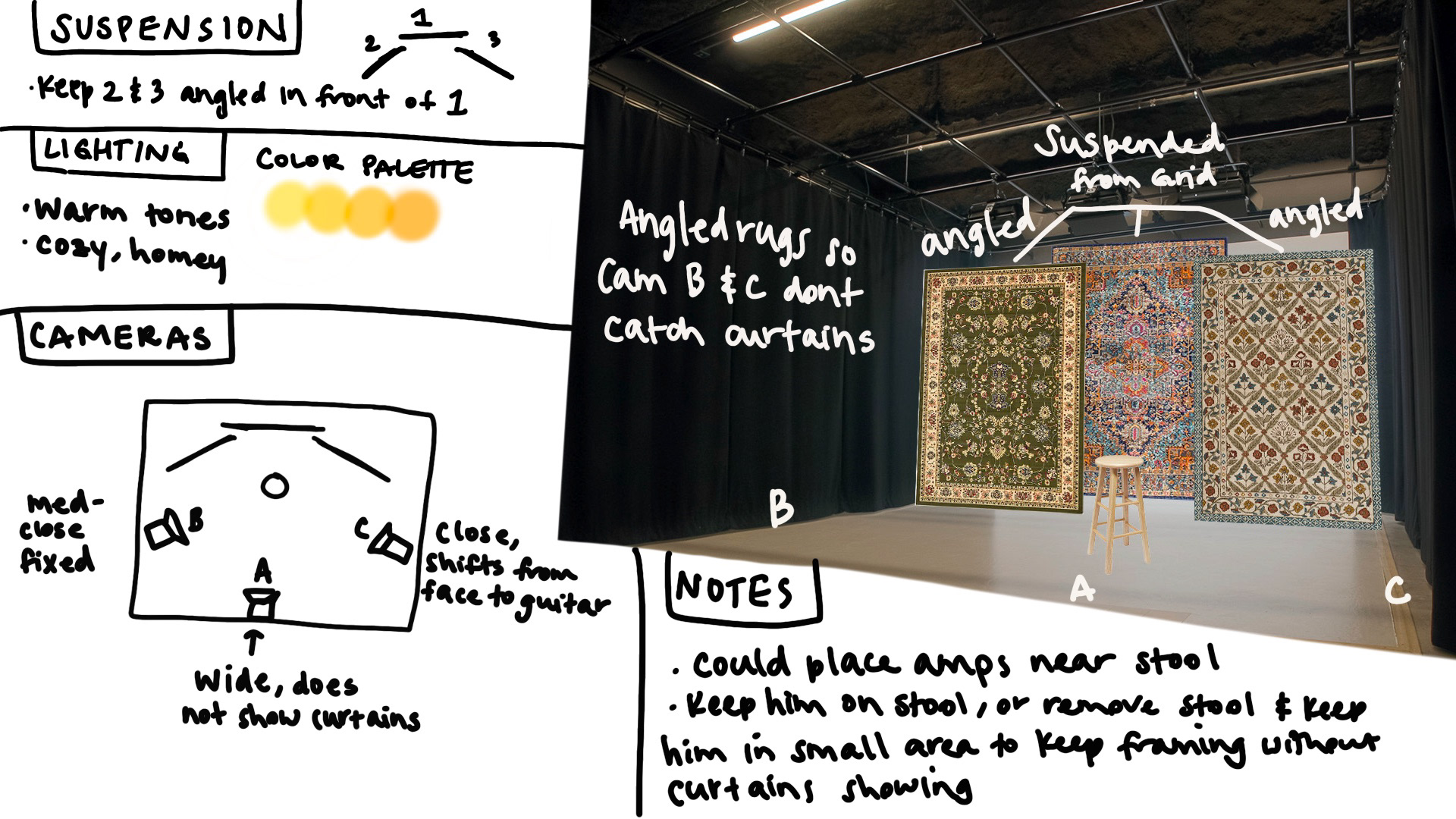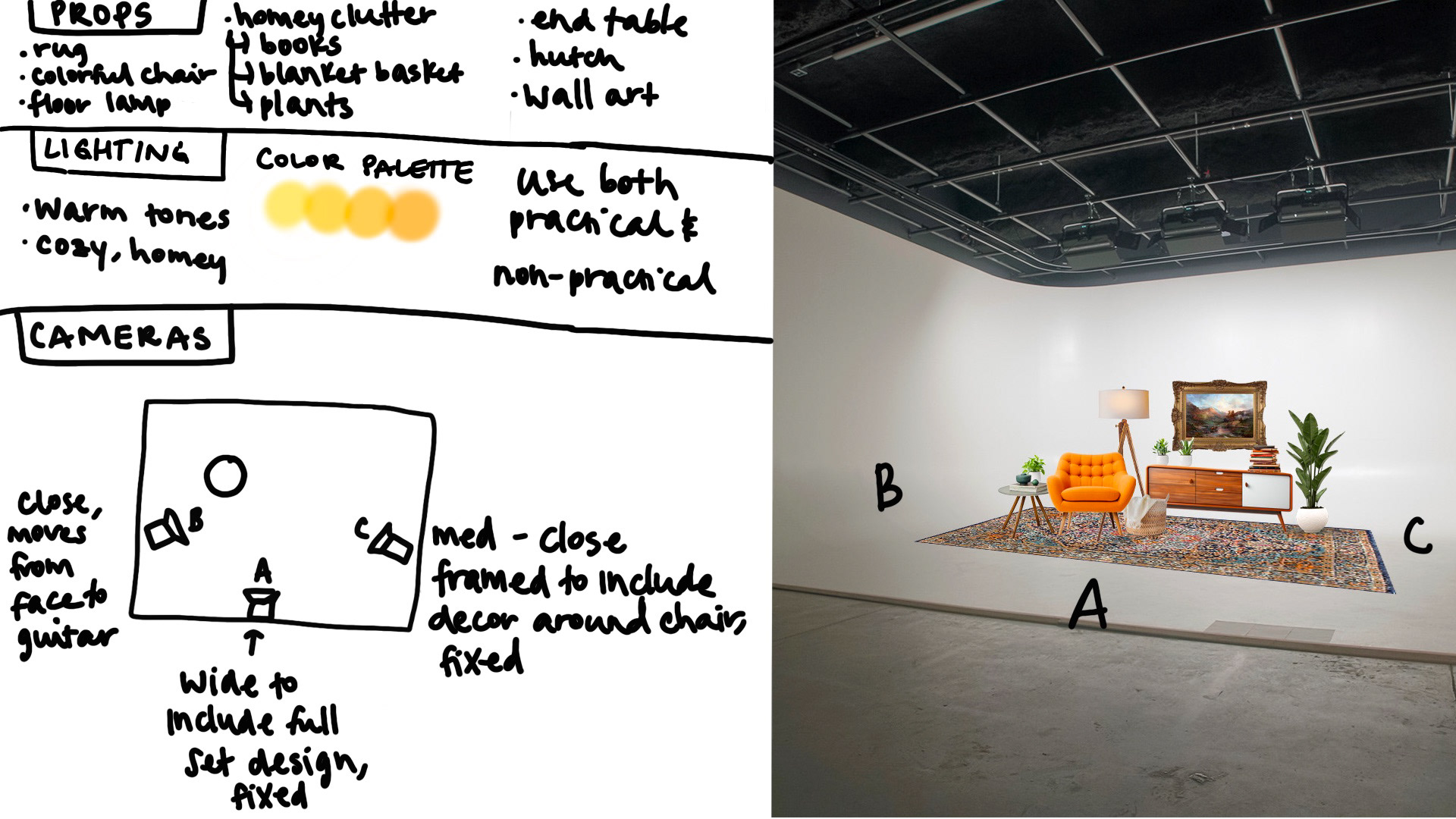 My graphic design skillset comes in handy during the preproduction phase of a video project. Whether its studio mockups or concept decks, I'm confident using Photoshop, Illustrator and InDesign to aid the task at hand. Below are some studio mockups.